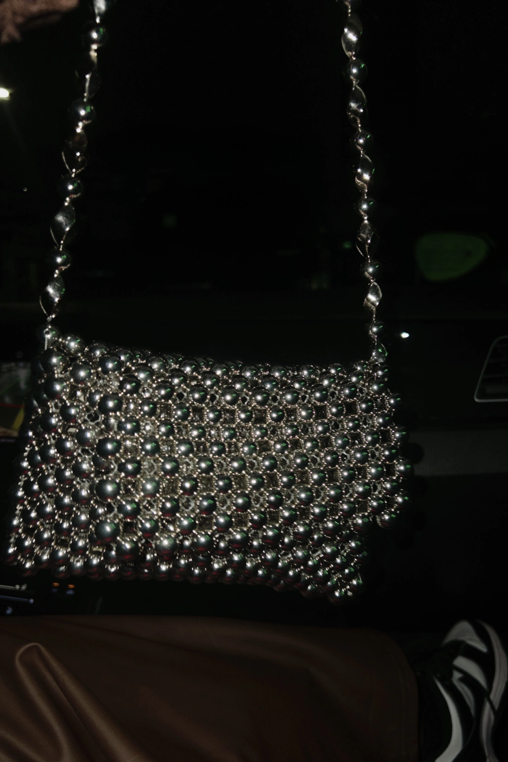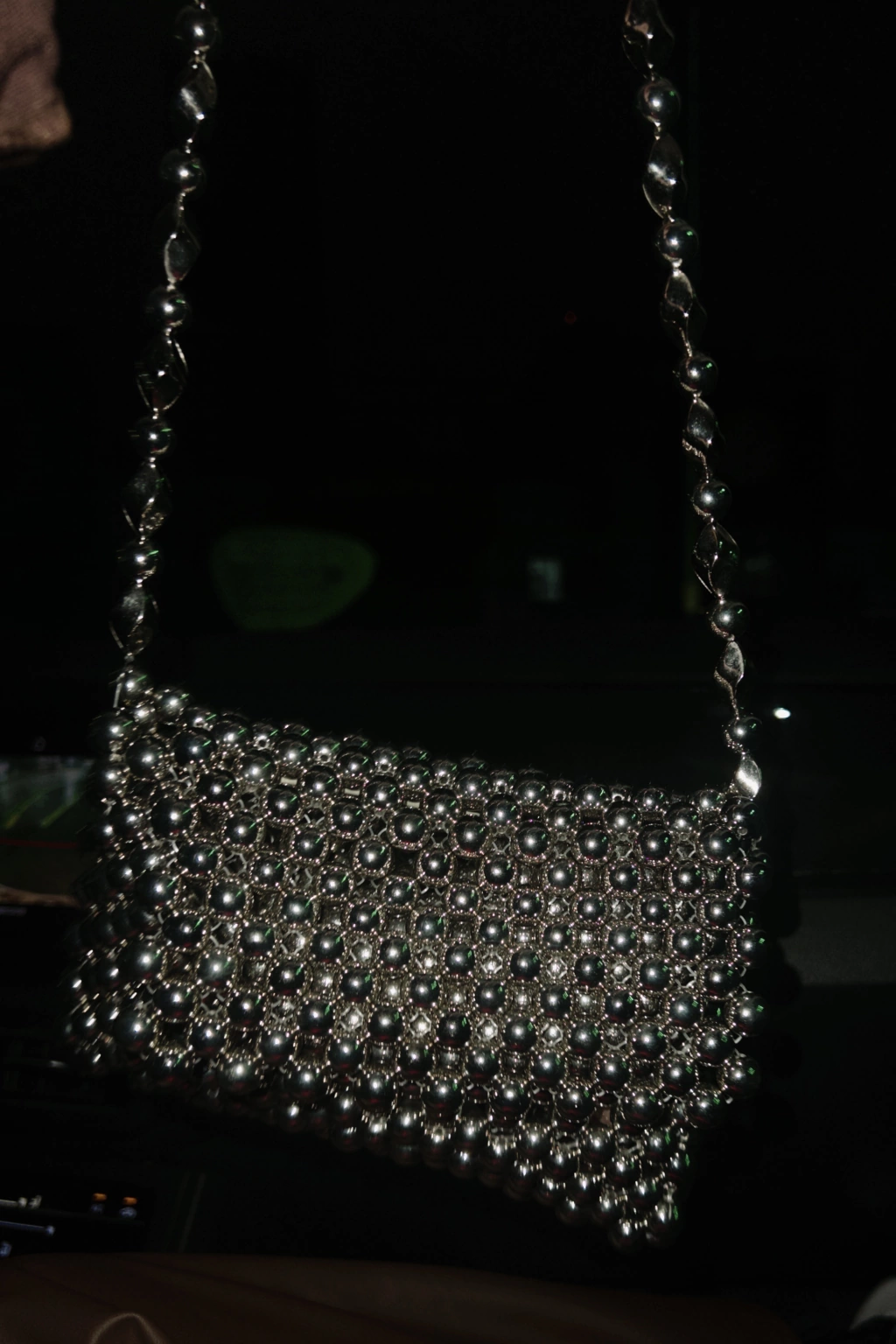 Beaded Bag confeccionada a mão. Miçangas na cor prata redonda, possui alça de miçangas tamanho médio. Cabe celular na bag.